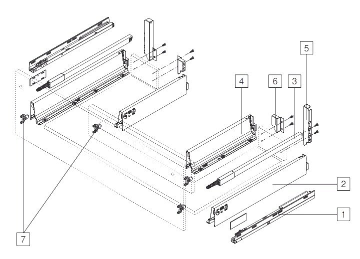 При ширине корпуса 750мм и более, а также для ящиков над дном корпуса и горизонтальной рейкой необходимо использовать держатель вала синхронизации и опору дна.